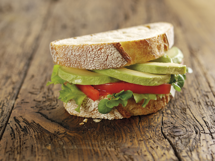 - Then layer the sliced tomato and avocado on top of the salad leaves before topping with the remaining slices of bread