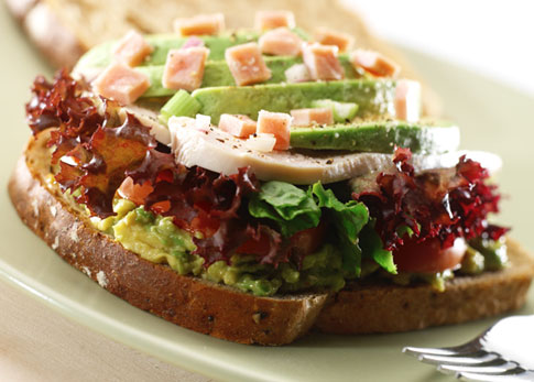 - Place the turkey, bacon, lettuce leaves and tomato on top