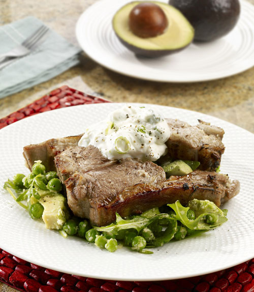 - Heat a grill on its highest setting and dab each chop with a tiny knob of butter. Grill for 3-4 minutes a side for pink or longer until cooked to your liking. To serve, place the pea and avocado salad on the plates, top with the cutlets and spoon over the yoghurt and mint dressing.