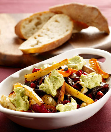 - Serve the vegetables with dollops of the avocado dressing and the toasted pumpkin seeds and pomegranate seed scattered over.